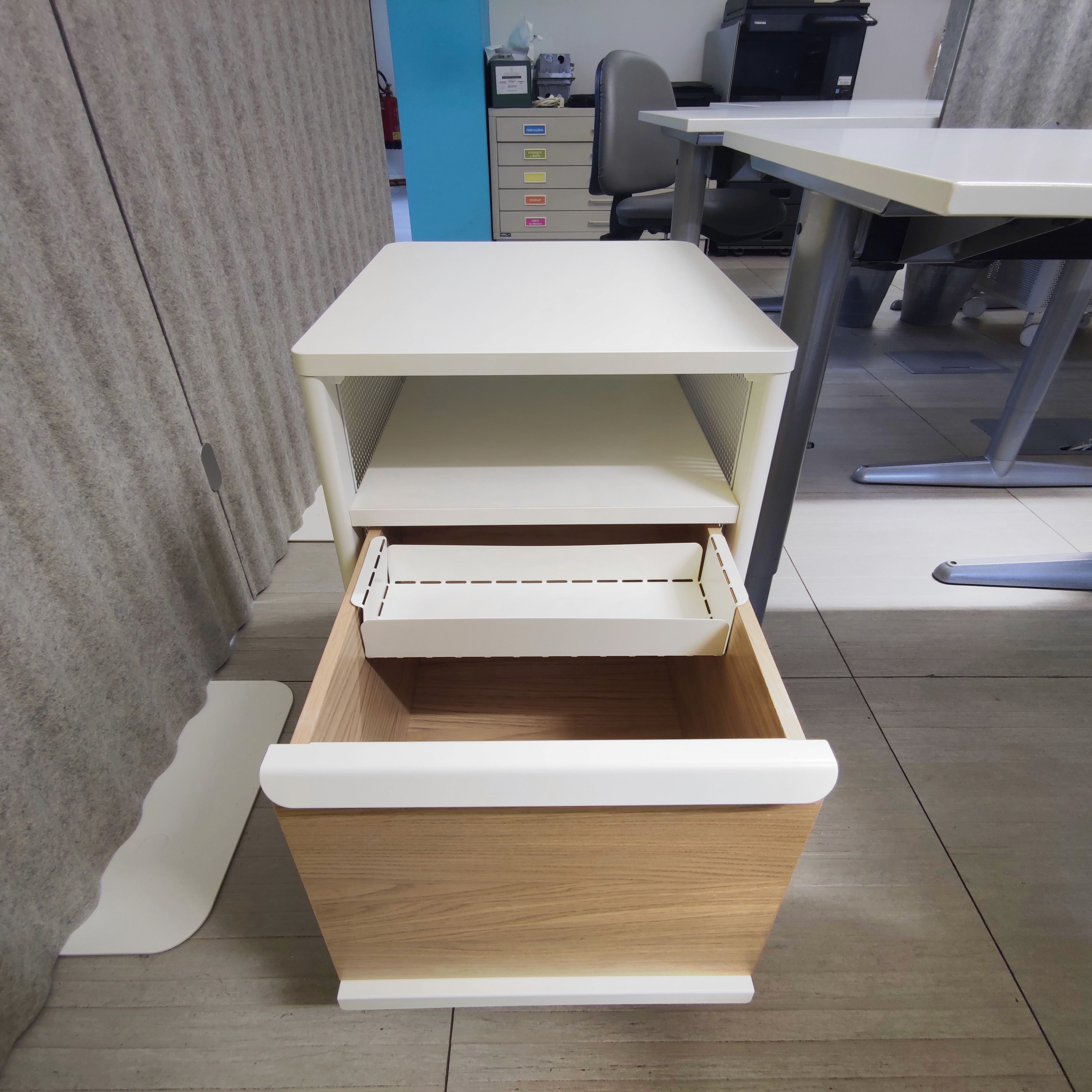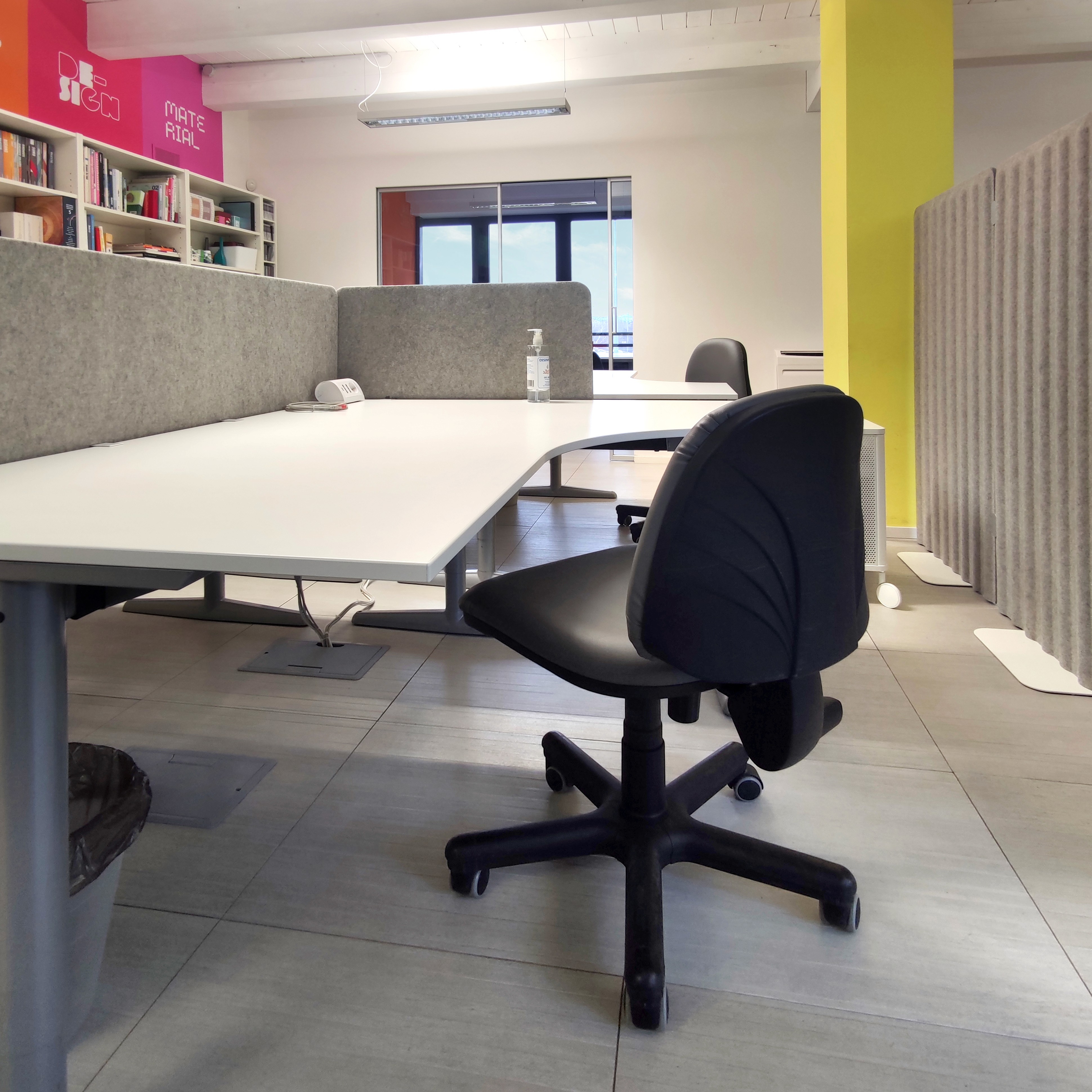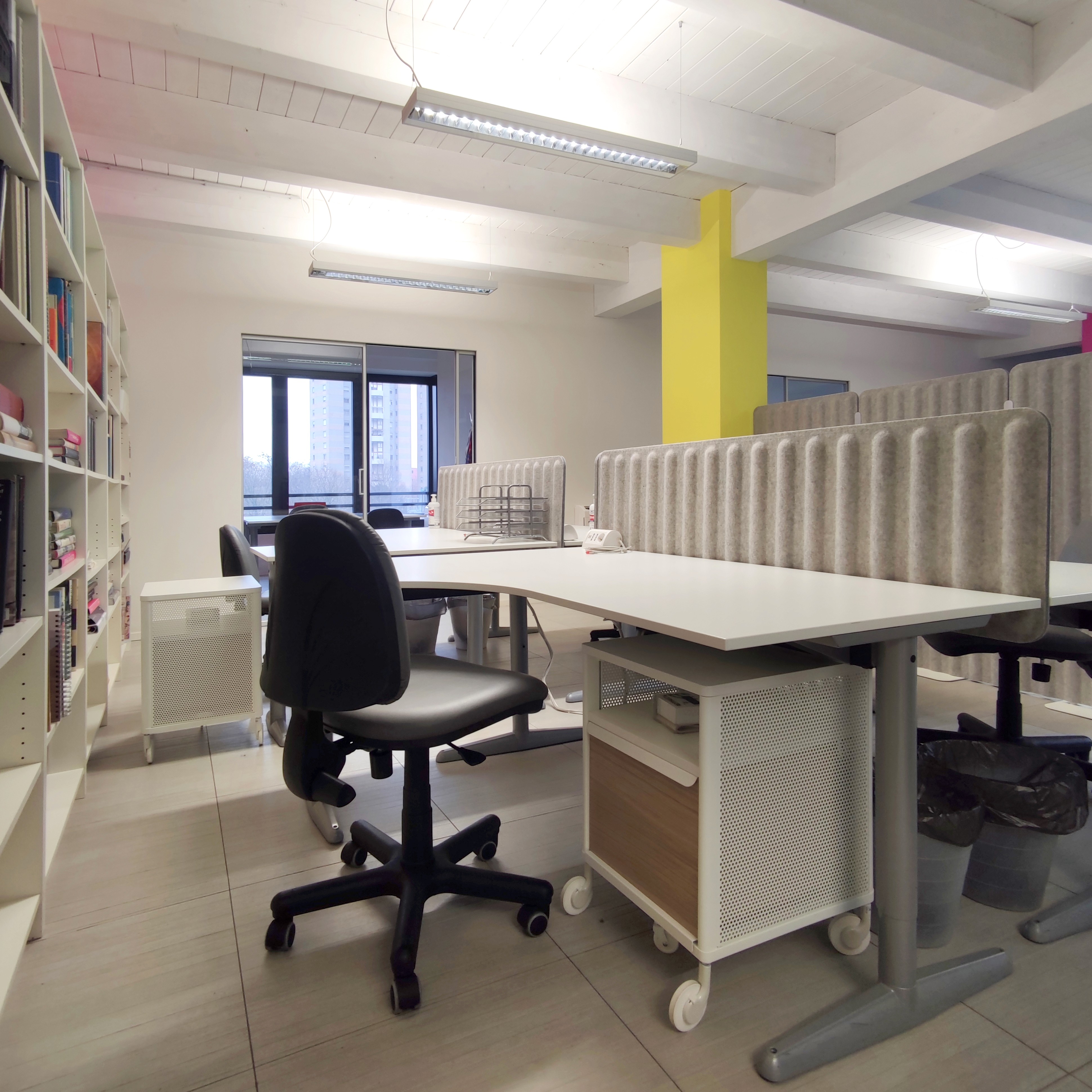 Scrivania ad uso esclusivo con cassettiera personale in open space silenzioso e stimolante.